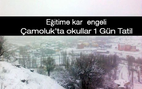 Çamoluk'ta etkili olan kar yağışı nedeniyle okullar bir gün süreyle tatil edildi. Çamoluk ve köylerinde etkili olan yoğun kar yağışı okulların tatil edilmesine neden oldu. Çamoluk Kaymakamlığı tarafından yapılan açıklamada olumsuz hava koşulları nedeniyle Çamoluk'ta eğitime bir gün ara verildiği,yapılacak değerlendirmelere göre bu sürenin uzatılabilece bildirildi. Çamoluk'ta eğitim gören öğrencilerin bir çoğu taşımalı eğitim nedeniyle servislerle çevre köylerden geliyor. Eğitimin devam etmesi halinde, kapanan köy yolları nedeniyle taşımada sıkıntıların yaşanabileceği bildirildi. Çamoluk Haber