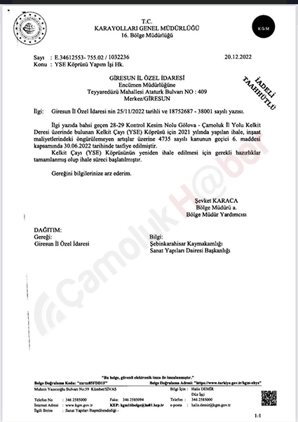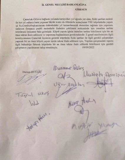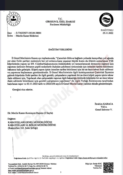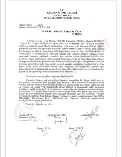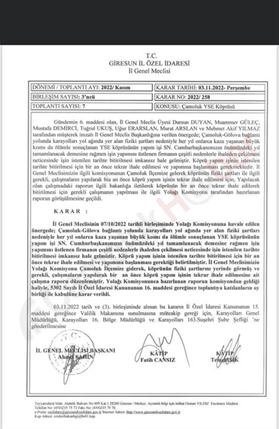"09.09.2022 tarihinde İl Genel Meclisimize, Meclis üyesi arkadaşlarımla birlikte verdiğim önerge ile İhale edilmesine ve Sn Cumhurbaşkanımız Recep Tayyip Erdoğan'ın 2023 ilk baharında biteceğini müjdelemesine rağmen hiç bir çalışma yapılmayan YSE köprüsü ile ilgili İl Genel Meclisi Üyesi arkadaşlarımla başlatmış olduğum süreçte; 12 Ekim 2022 tarihinde ilçemize gelerek komisyon raporu tutan İl Genel Meclisi yol ağı komisyonu üyelerimizin tutmuş olduğu, köprünün acilen yapılmasının gerektiğini belirten raporumuz, 3 Kasım 2022 tarihinde okunarak oy birliği ile Meclisten geçirilirmişti. İl Genel Sekreterimizin Eklediği üst yazı ile birlikte, 25 Kasım 2022 tarihinde Karayolları Genel Müdürlüğü ve Karayolları Bölge Müdürlüğüne talep olarak iletilmiştir. Karayolları Genel Müdürlüğü çalışmamız neticesinde meclisimize verdiği 20.12.2022 tarihli cevabında; İhale sürecinin resmen başladığını belirterek, 13. Ocak 2023 tarihinde YSE köprümüzün ihalesini yapmıştır. Bu günlerde şantiyesi kurularak yapımına başlanan ve en kısa sürede tamamlanması planlanan YSY köprüsünün yapılmasında emekleri olan ve beni yalnız bırakmayan, Başta Giresun Valimiz Sn. Enver Ünlü beye, İl Genel Meclisi Başkanımız Ahmet Şahin’e, İl Genel Meclisi Yol Ağı Komisyonu Başkanı Cafer Mavi ve Komisyon üyesi arkadaşlarıma, konuyla ilgili meclise önerge verdiğim ilk günden beri tüm kararları oybirliğiyle kabul ederek memleket menfaatine olan bu çalışmayı destekleyen Meclis üyesi arkadaşlarıma, Şahsım ve ilçem adına teşekkür ediyorum.