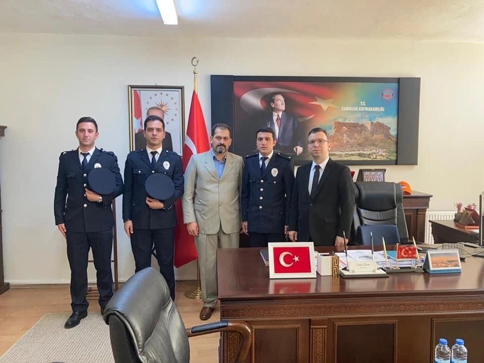 Türk Polis Teşkilatı'nın kuruluşunun 177. yıl dönümü ve Polis Haftası dolayısıyla İlçe Emniyet Amiri Mustafa Arslan ve Emniyet personeli, Çamoluk Kaymakamı Furkan Berber'i makamında ziyaret etti.
