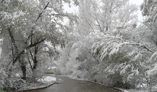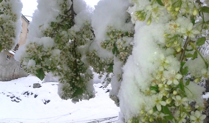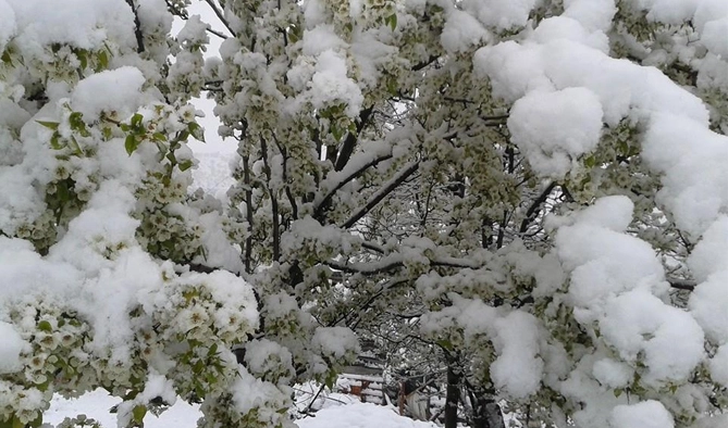 Ağaçların çiçek açtığı Çamoluk'ta,kar ile birlikte ender rastlanacak görüntüler meydana geldi.