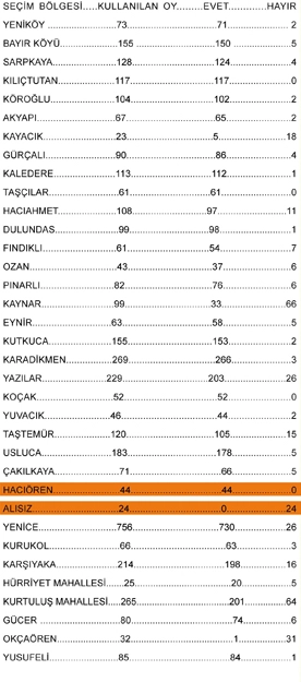 Hacıören Köyünün Referandum Sonuçları