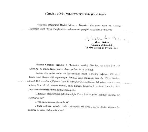 Giresun Millet vekili Murat Özkan,Çamoluk'a banka şubesi açılmasıyla ilgili olarak mesliste soru önergesi verdi.